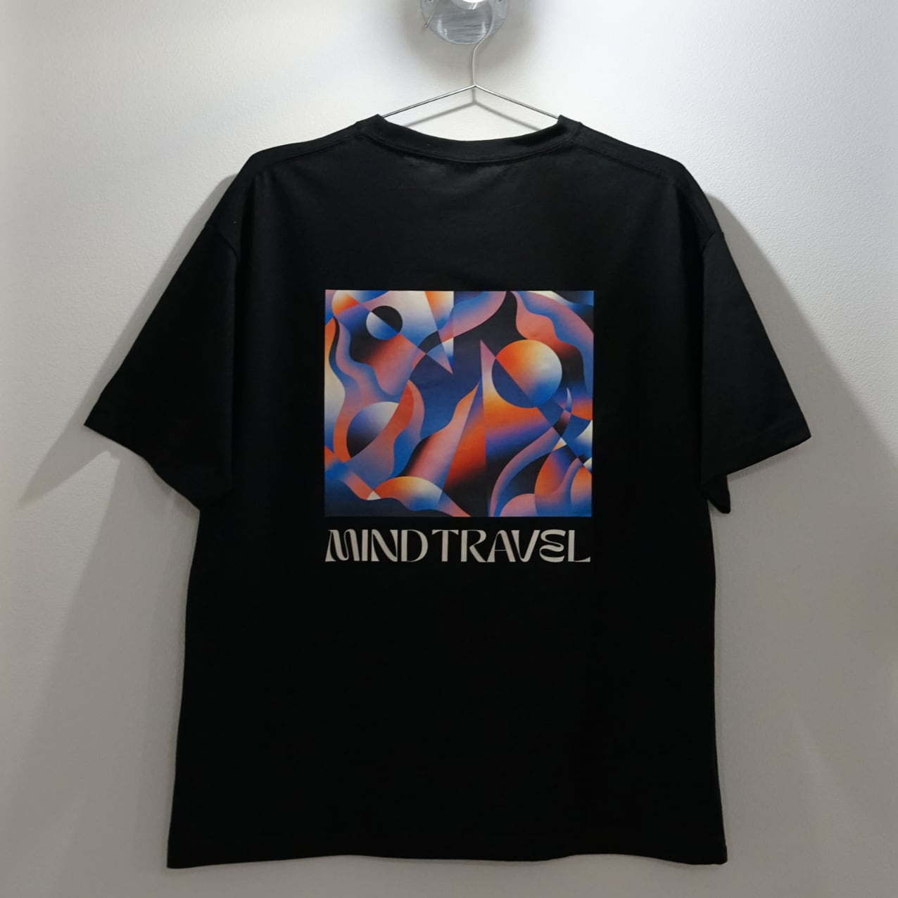 An original T-shirt featuring the logo of MIND TRAVEL, the music festival organized by Spincoaster.